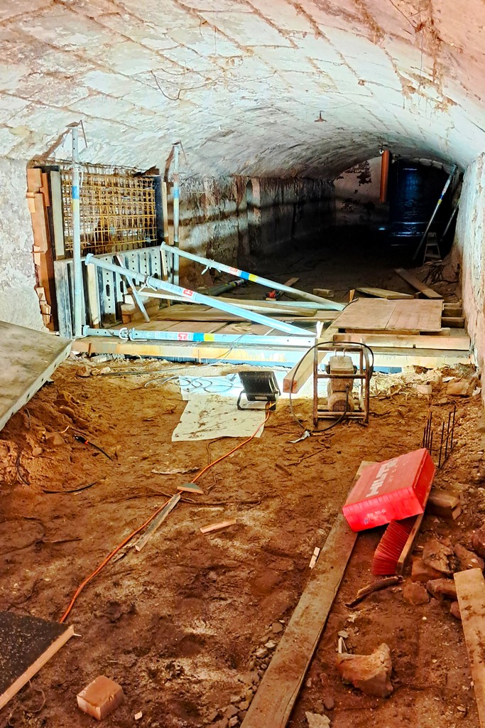Bild 1 und 2: Im hinteren großen Kellerraum war eine Stützmauer nötig. Diese wurde an der tragenden Wand zwischen den beiden großen Kellerräumen eingebracht.