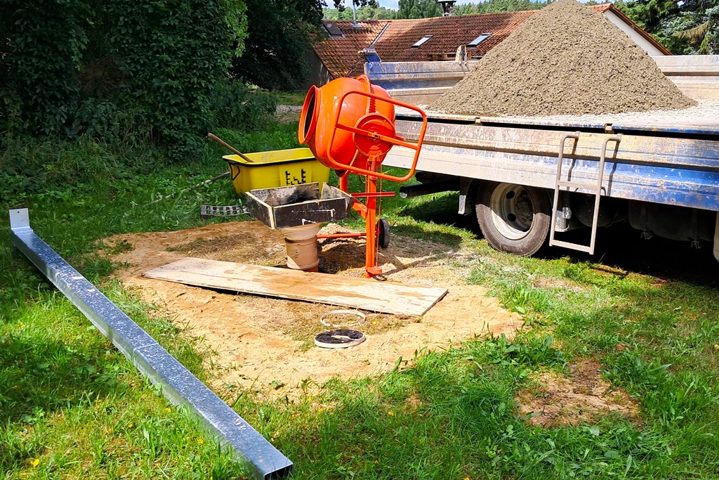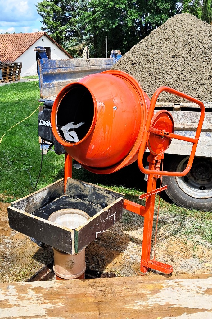 Bild 3 und 4: Der nötige Beton für die Stützmauer wird oberhalb des Kellers gemischt und durch einen noch nicht ausbetonierten Schacht eingelassen.