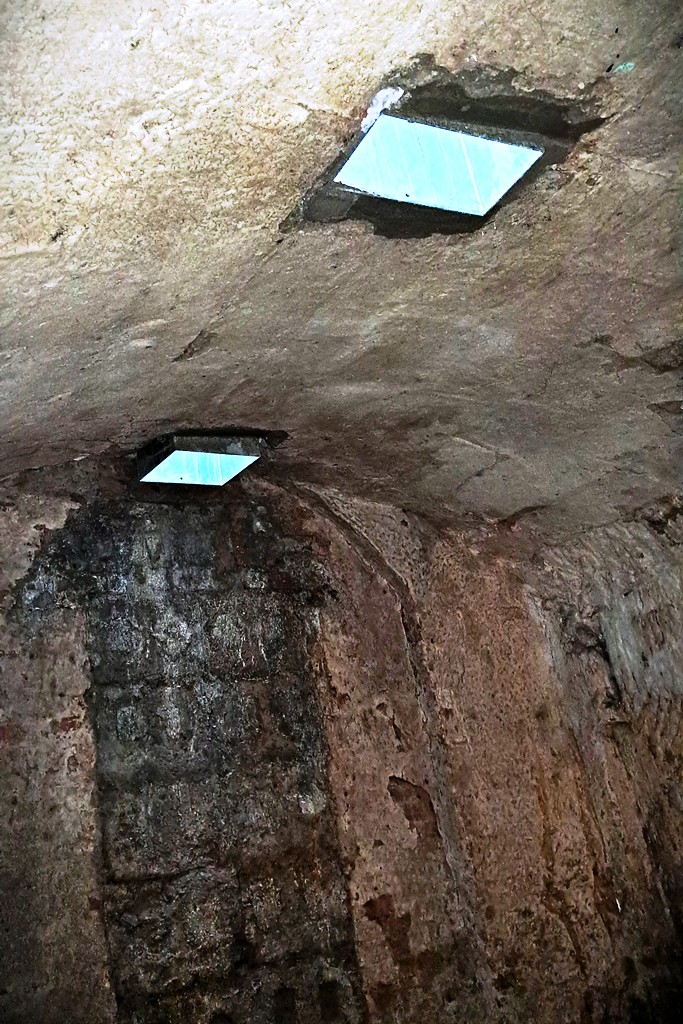 Rechtes Bild: An der Kellerdecke spenden zwei der fertig ausbetonierten Schächte etwas Helligkeit und sorgen hautsächlich für die Belüftung des Kellers.